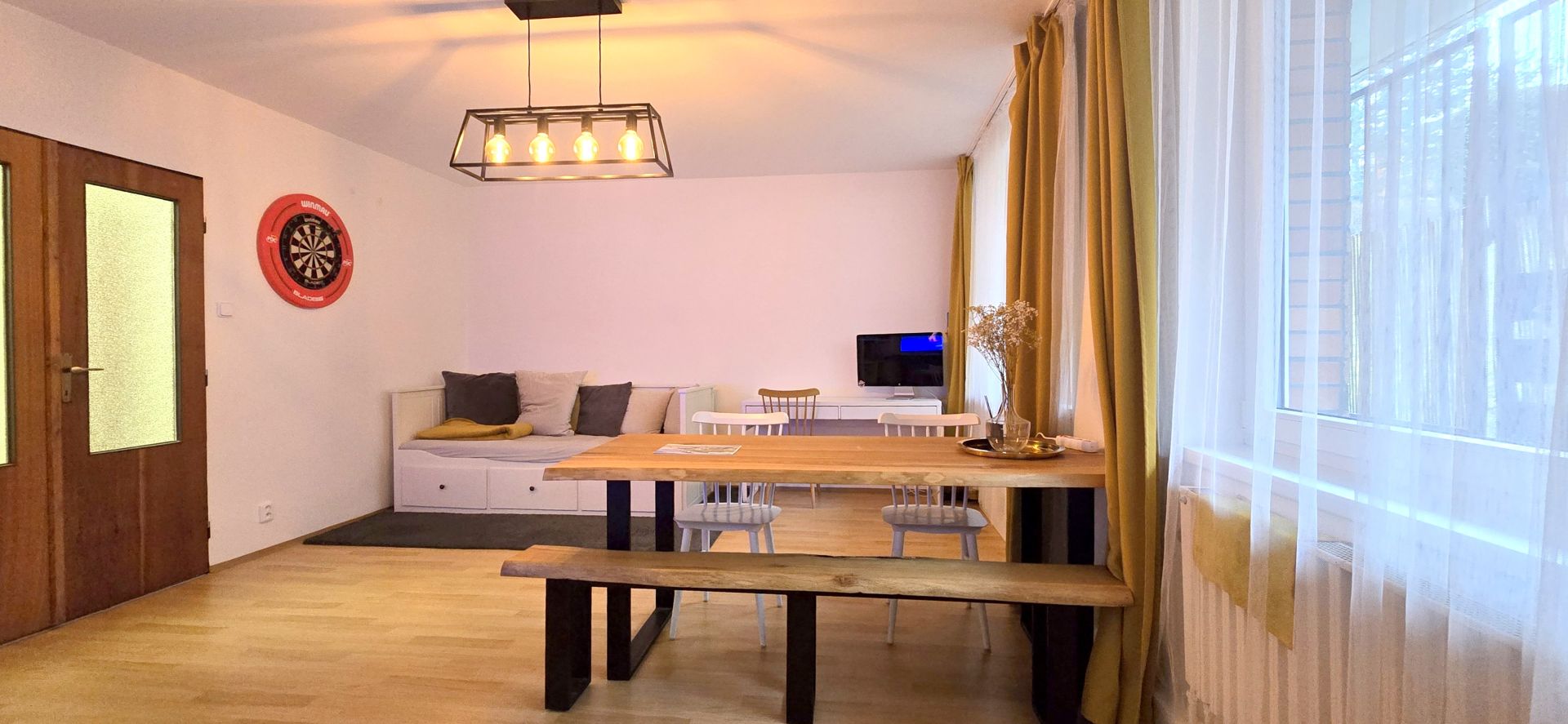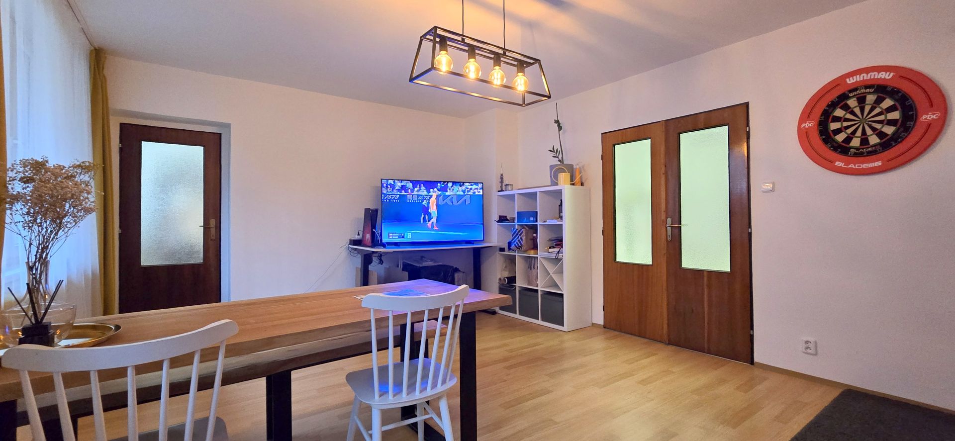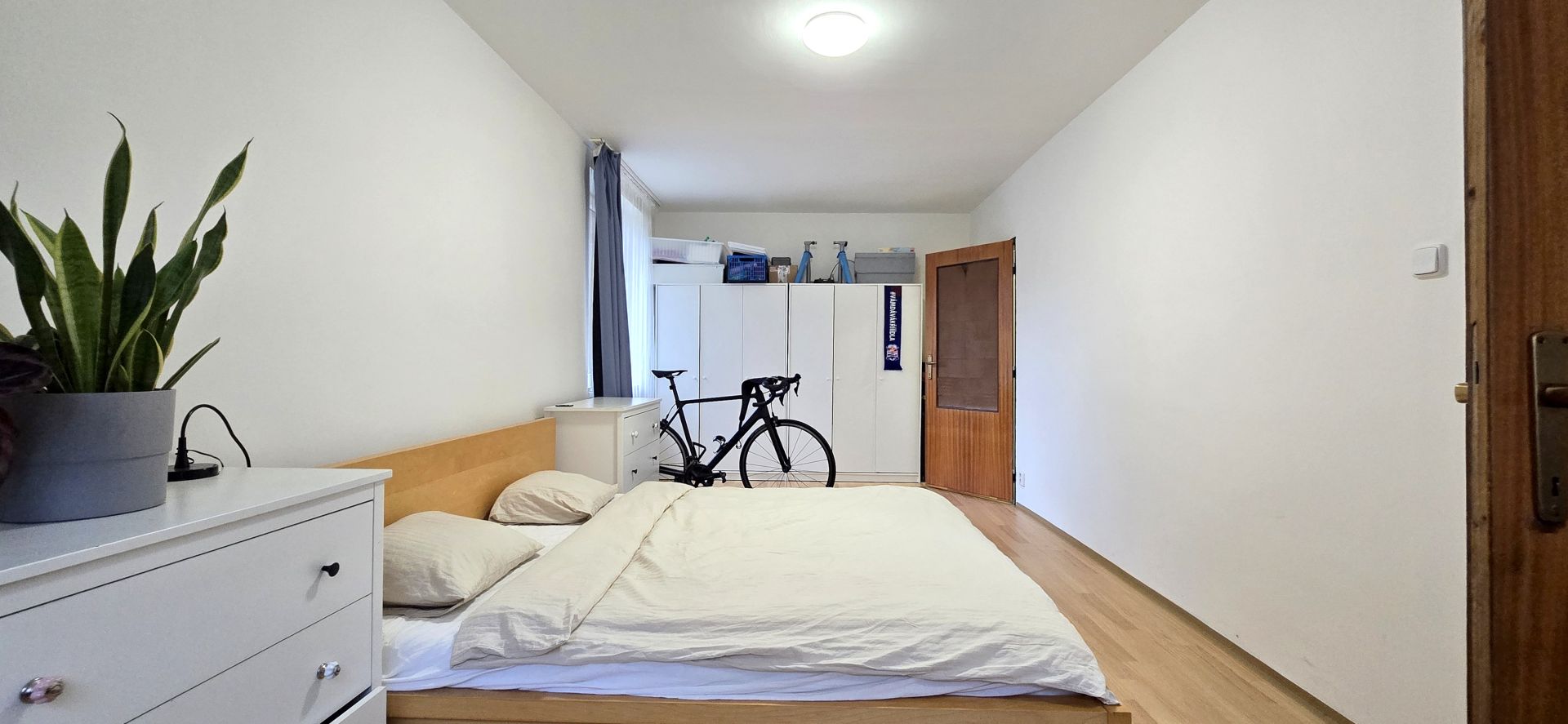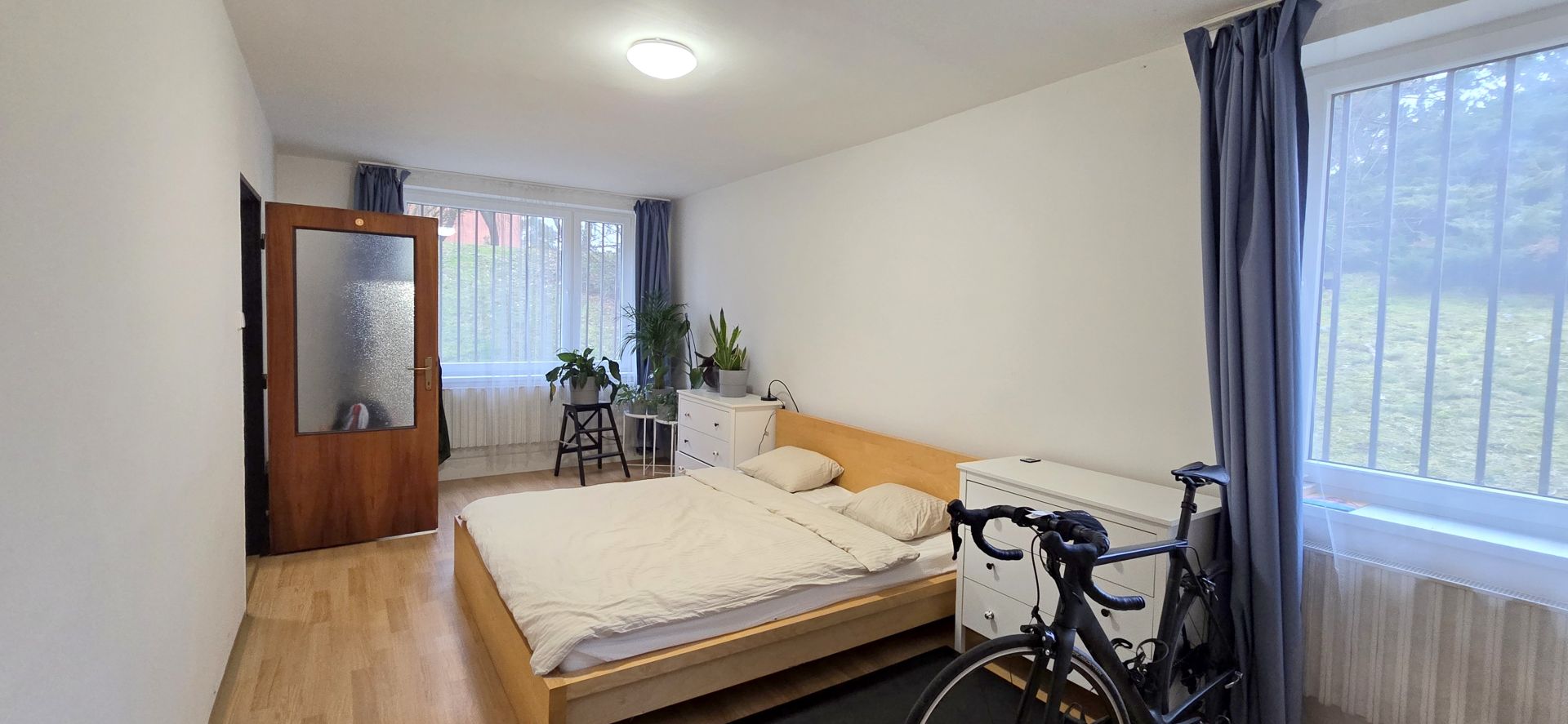 Byt má plnohodnotná okna, což zajišťuje dostatek přirozeného světla. Dispozice bytu je zřejmá z přiloženého půdorysu v sekci fotografie (obývací pokoj 23,62 m2, předsíň 9,5 m2, kuchyně 7,18 m2, ložnice 21,48 m2, koupelna 5,52 m2, komora 2,54 m2). Podlahová plocha celkem činí cca 69,84 m2 plus lodžie cca 6 m2, přičemž uvedené rozměry jsou přibližné.