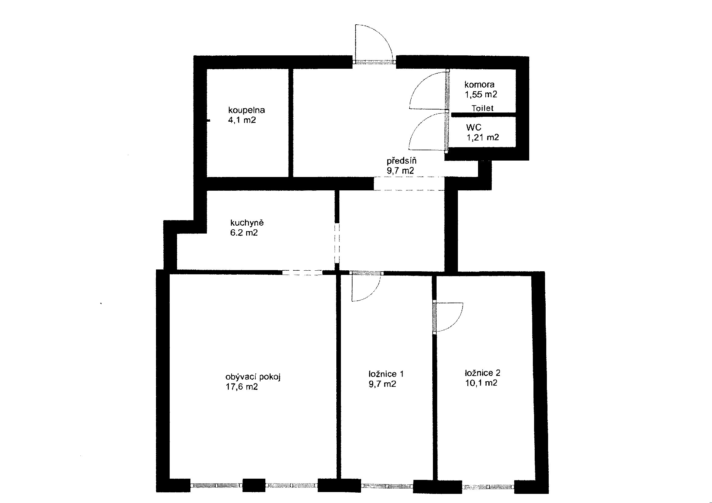 Uvnitř byt nabízí promyšlenou dispozici, která zahrnuje prostornou předsíň o rozloze přibližně 9,7 m2, koupelnu s plochou cca 4,1 m2, praktickou komoru o velikosti cca 1,55 m2 a samostatnou toaletu s rozměry přibližně 1,21 m2. Dále se zde nachází kuchyně o výměře cca 6,2 m2, světlý obývací pokoj o ploše zhruba 17,6 m2 a dvě útulné ložnice, z nichž jedna má přibližně 9,7 m2 a druhá 10,1 m2. Pro lepší představu o uspořádání je k dispozici detailní půdorys v sekci fotografií, přičemž všechny uvedené rozměry jsou orientační.