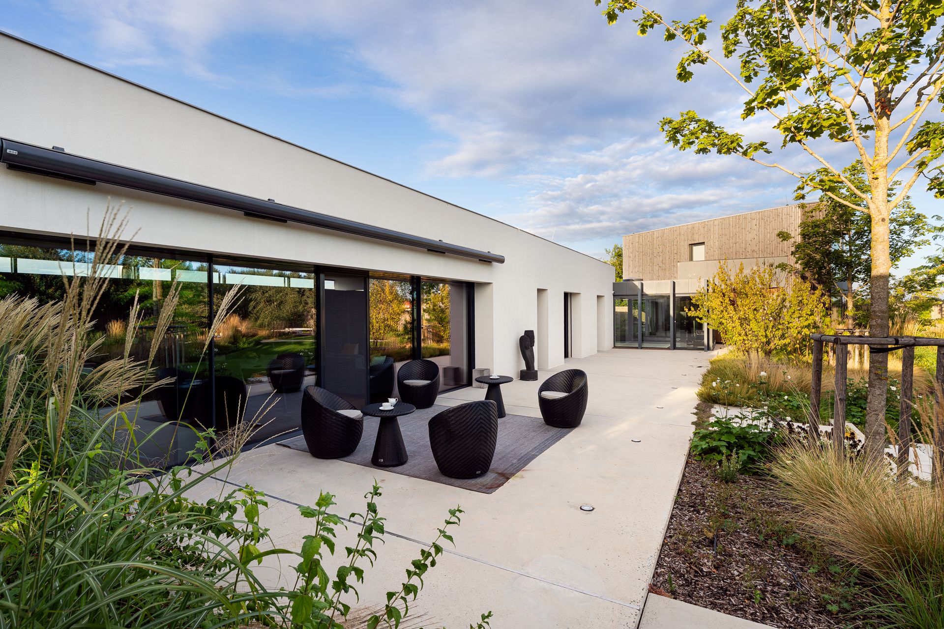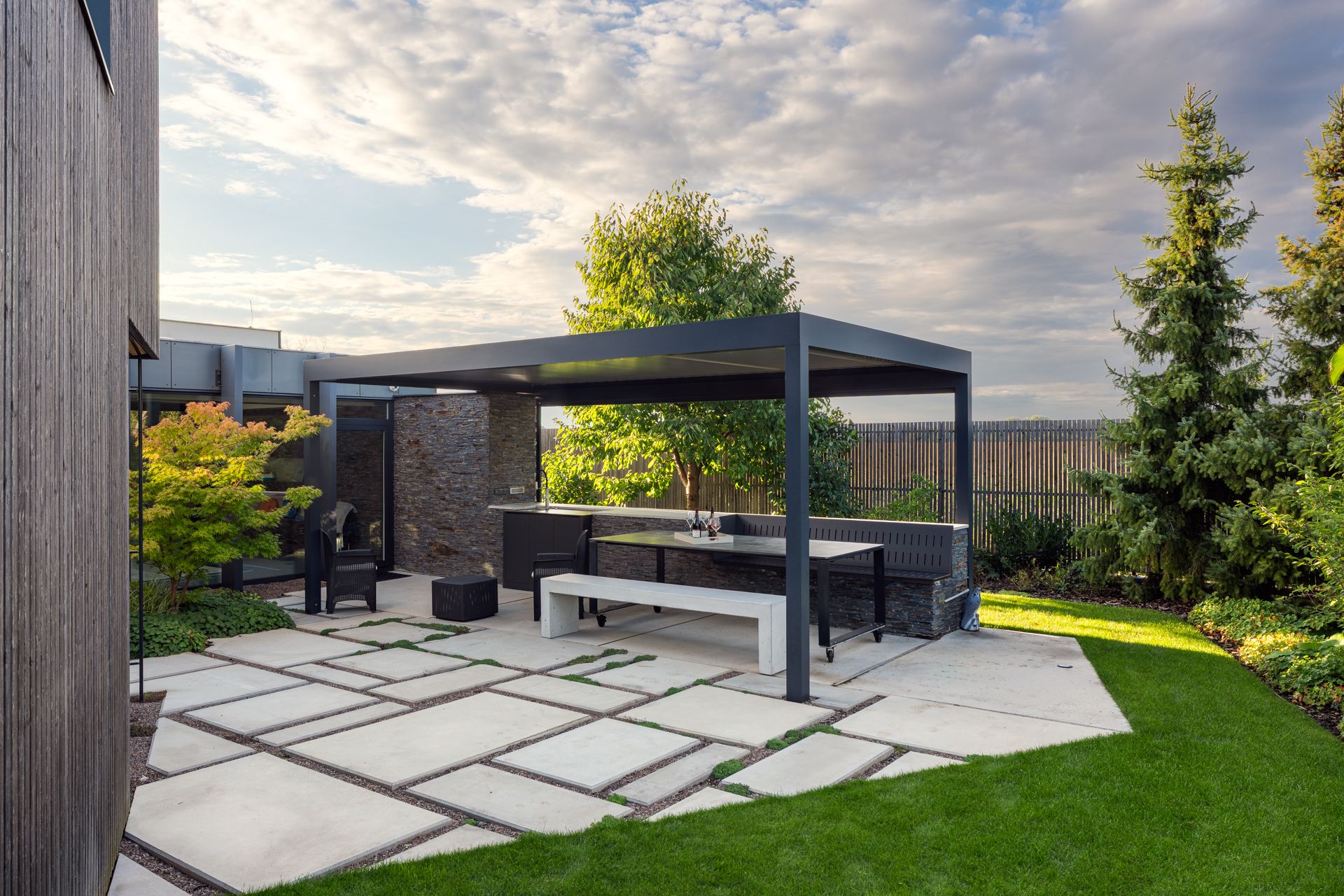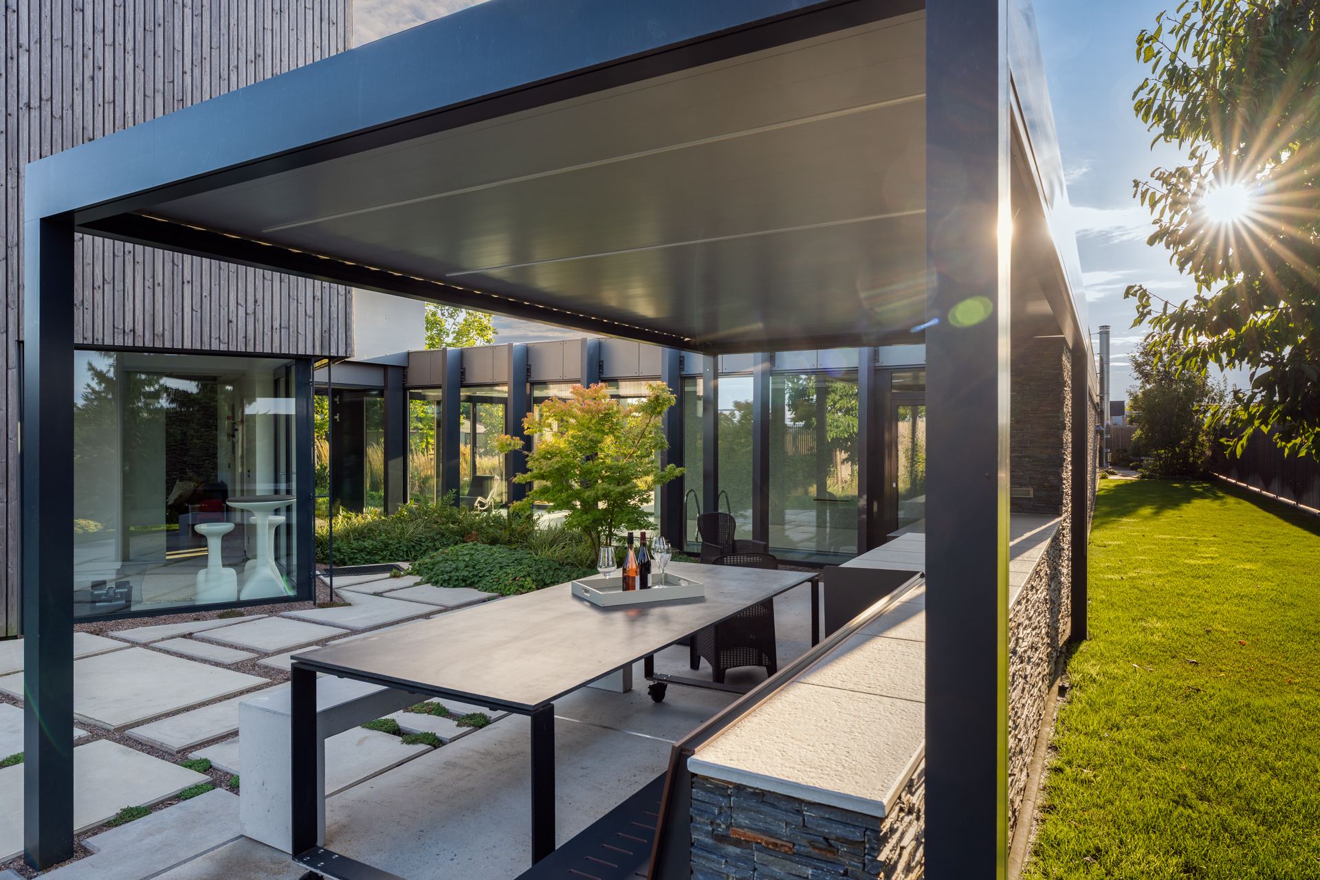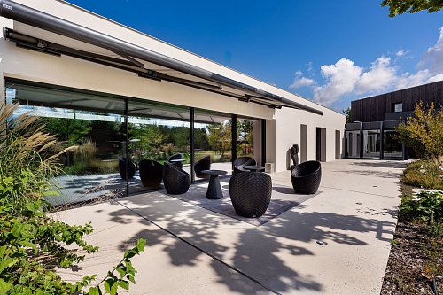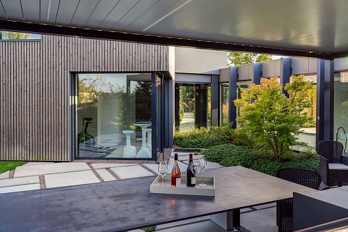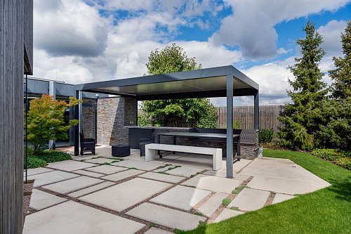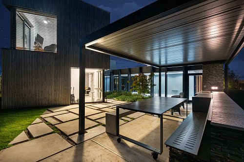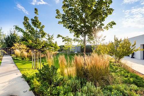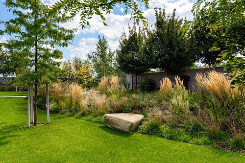 Na bazén navazuje společenská zóna s posezením, grilem, ohništěm a pergolou Sun Systém, dětské hřiště, trávník na míčové hry, relaxační kouty, designový zahradní nábytek Artie nebo venkovní stůl Graveli.