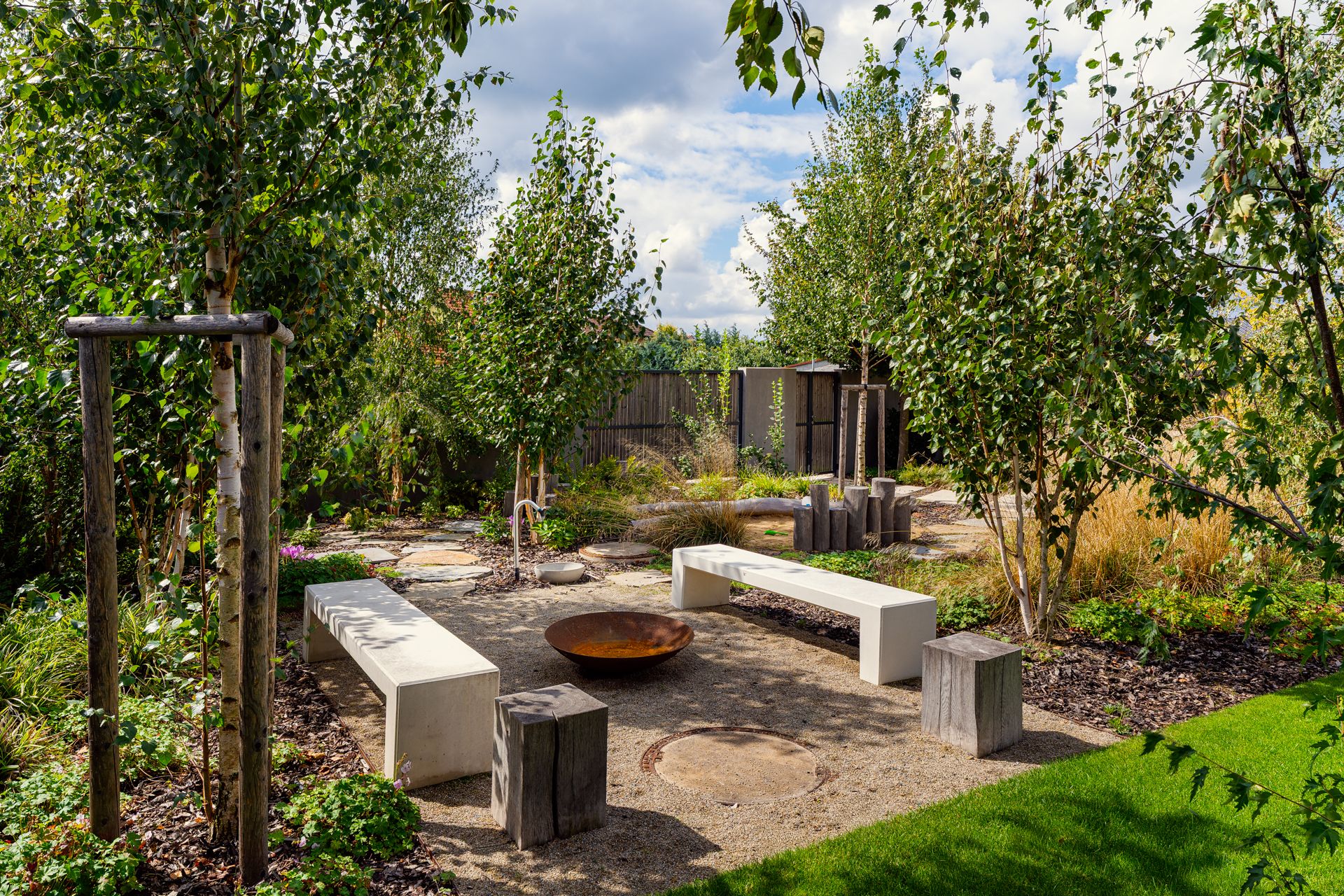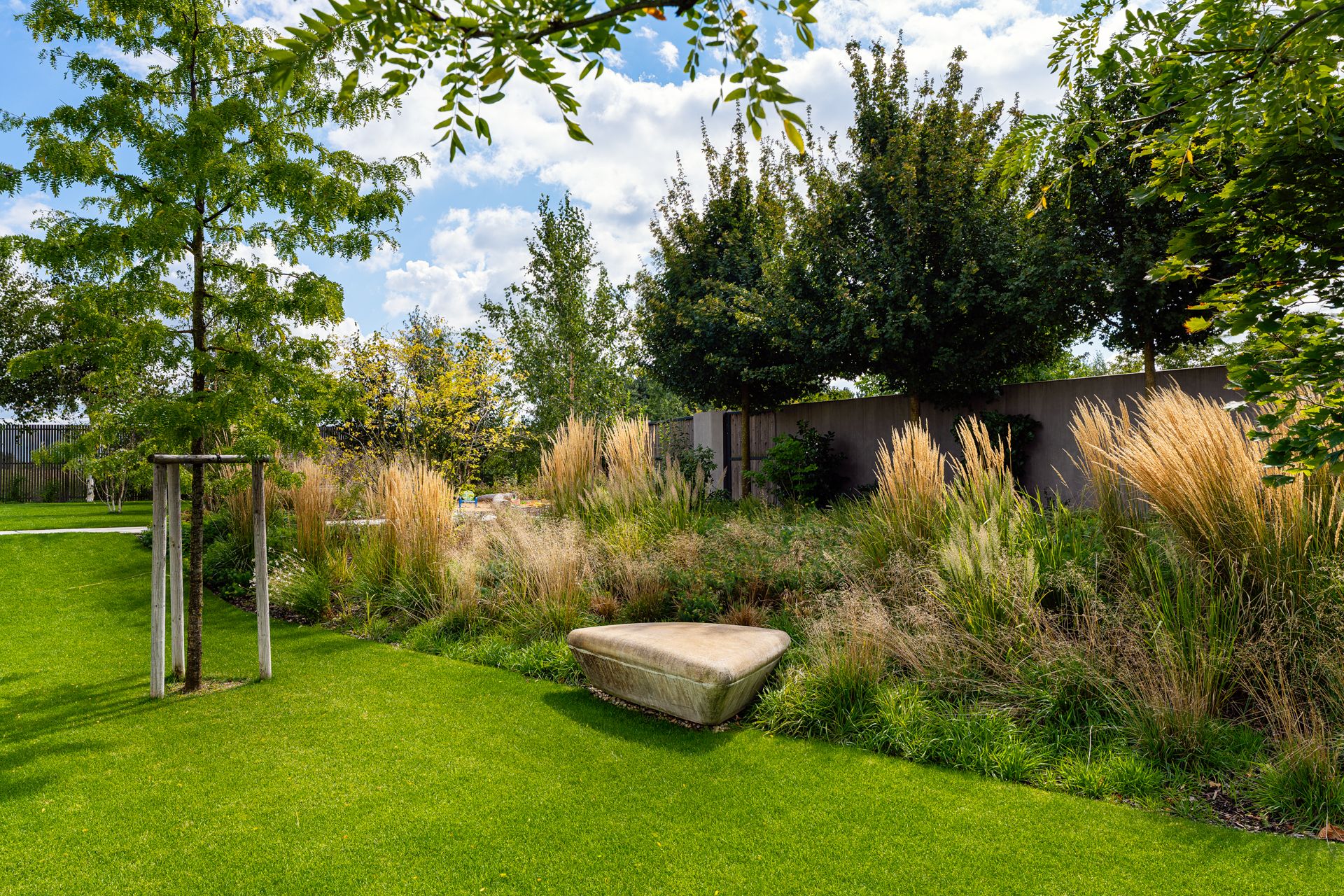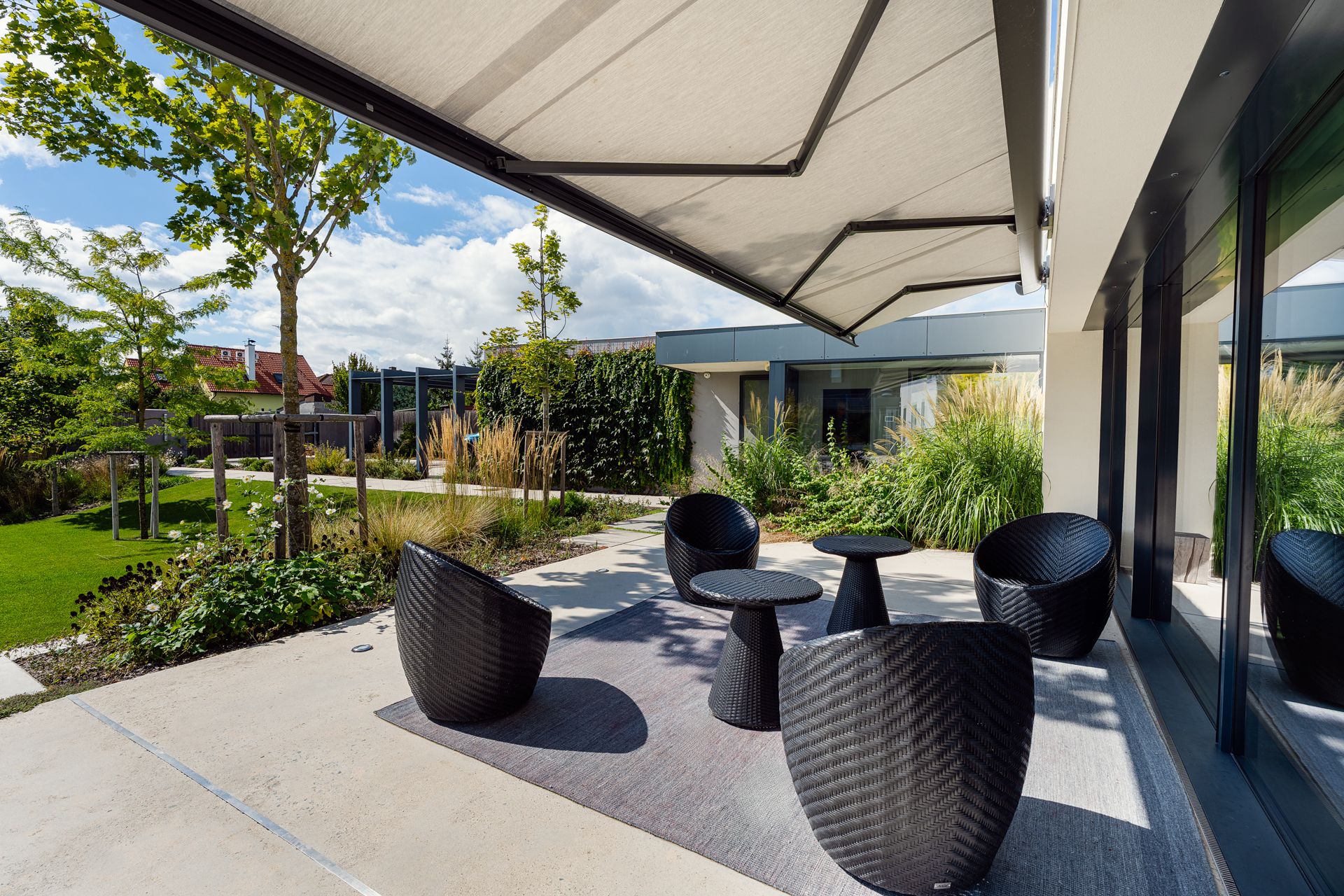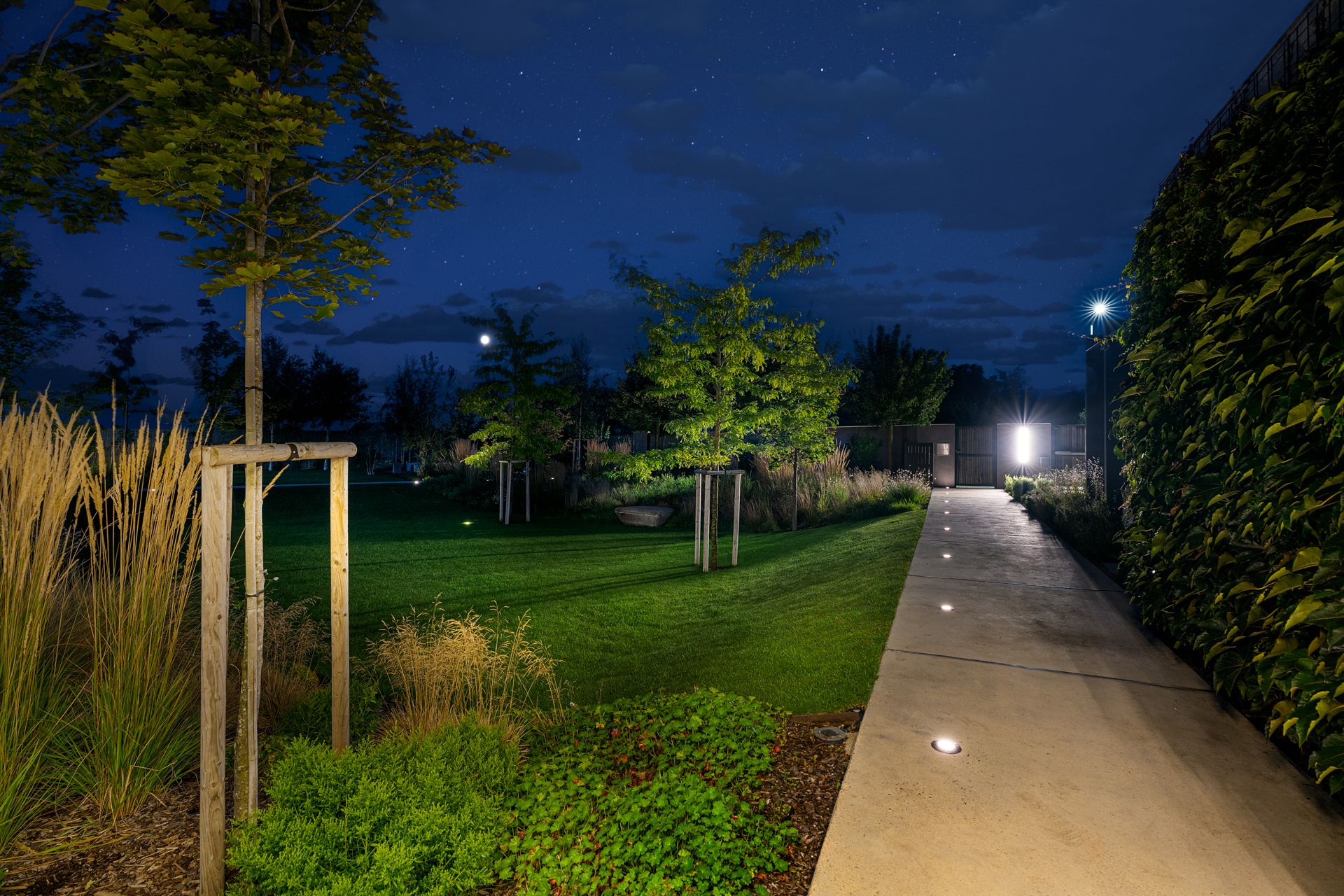 Na bazén navazuje společenská zóna s posezením, grilem, ohništěm a pergolou Sun Systém, dětské hřiště, trávník na míčové hry, relaxační kouty, designový zahradní nábytek Artie nebo venkovní stůl Graveli.