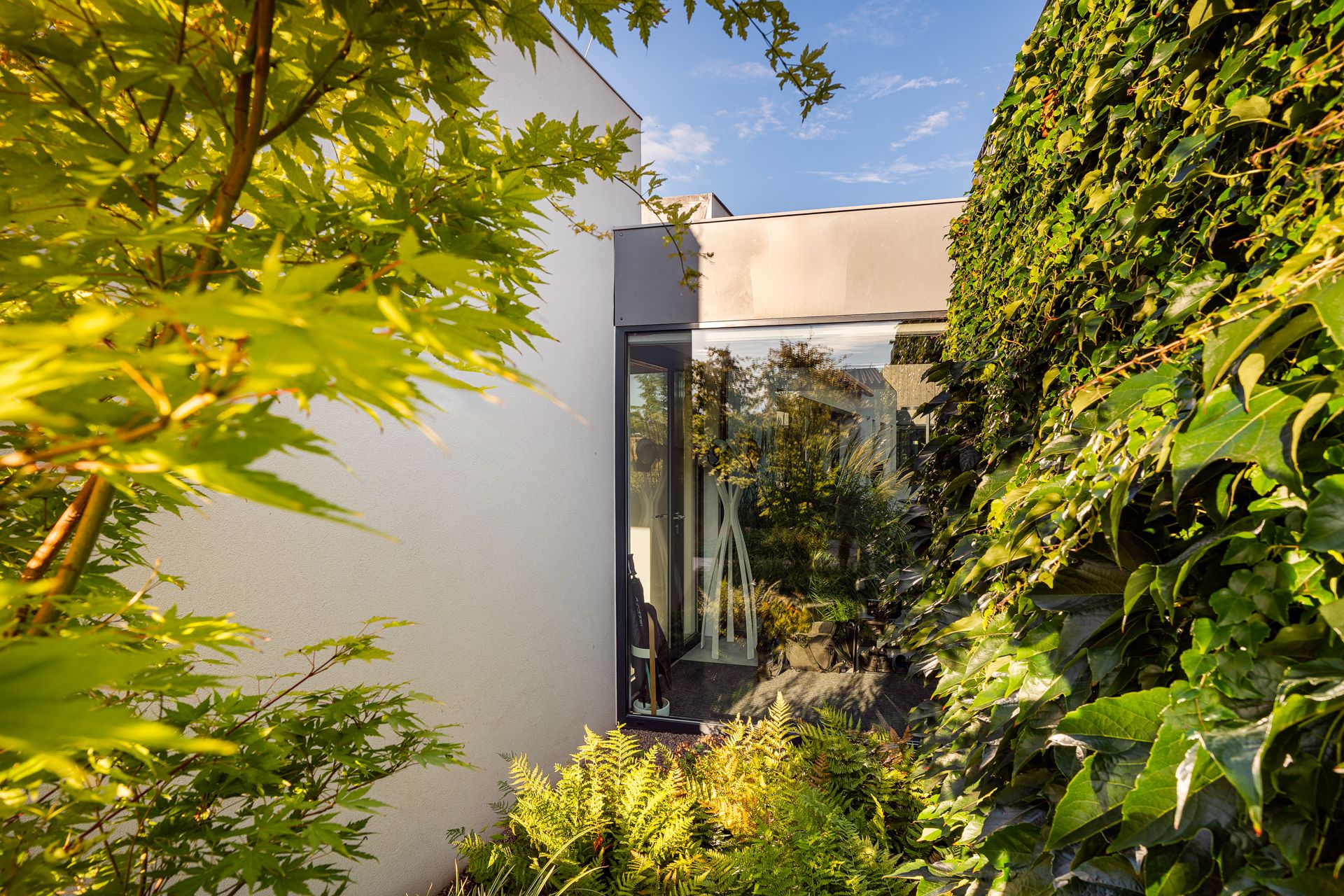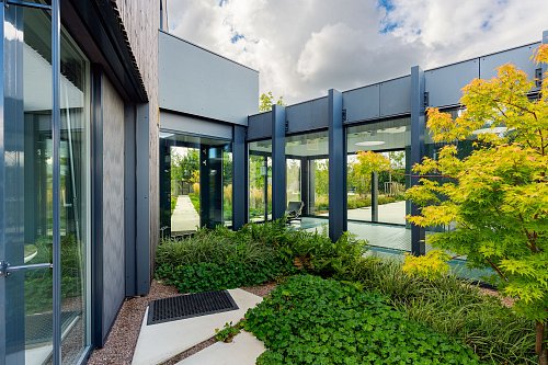 Tato originální architektonická koncepce domu poskytuje díky prosklení pohledy napříč domem a zahradou z různých úhlů. Díky tomu má člověk pocit bydlení v přírodě.