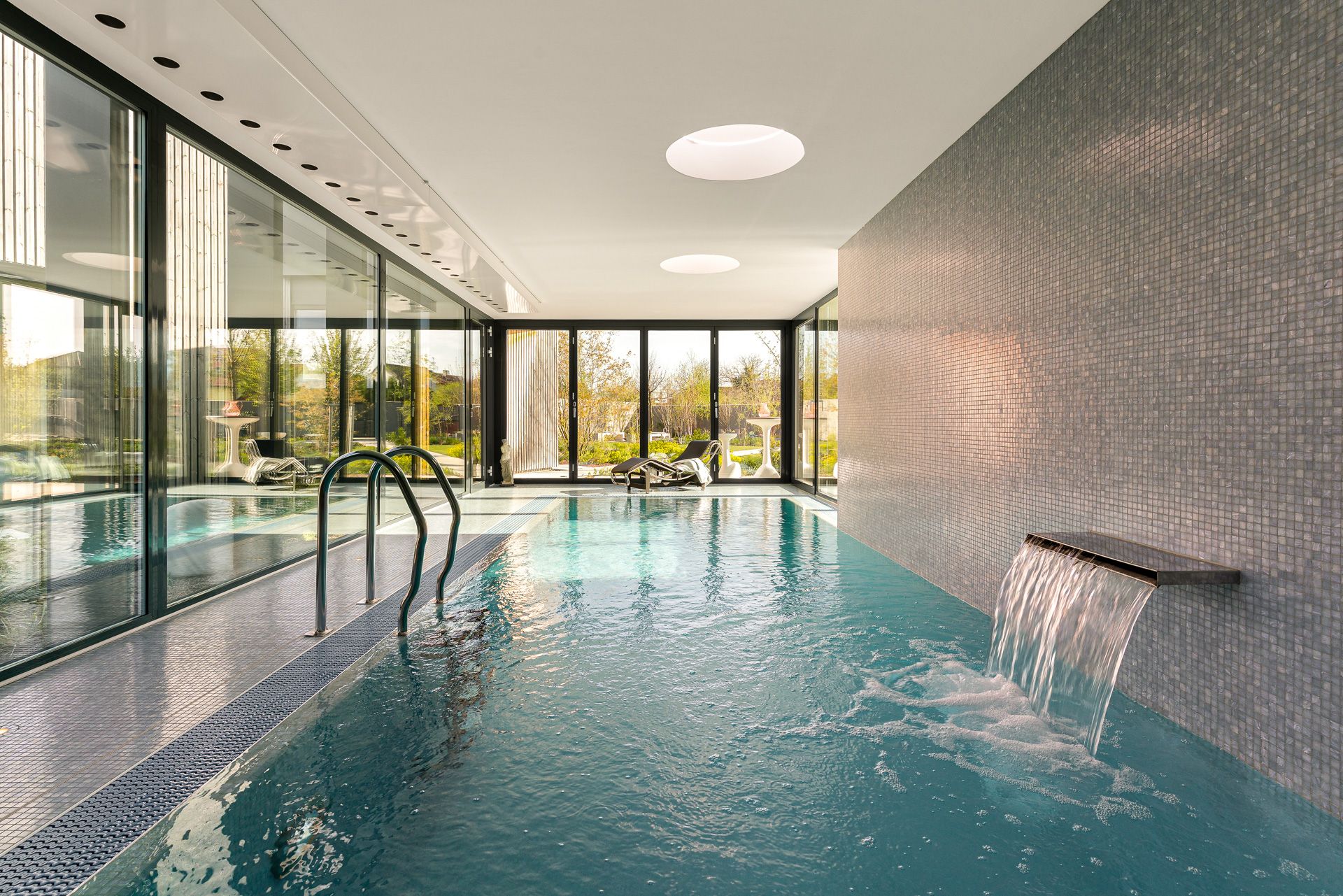 Krytý bazén (7,0 × 2,7 m) s proti-proudem a chrličem vody je ideálním místem pro odpočinek a aktivní relaxaci.