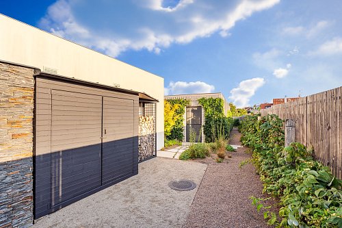 Součástí komplexu je také prostorná dvougaráž a zastřešené parkování pro další vozy, které podtrhují eleganci celého projektu.